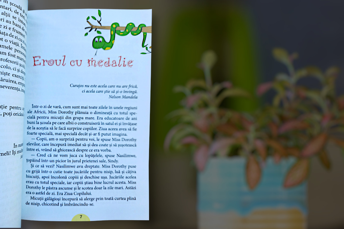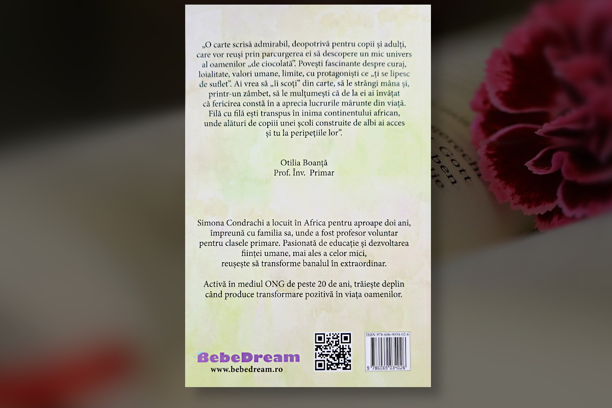 Povești fascinante despre curaj, loialitate, valori umane, limite, cu protagoniști ce „ți se lipesc de suflet”. Ai vrea sa „îi scoți” din carte, să le strângi mâna și, printr-un zâmbet, să le mulțumești că de la ei ai învățat că fericirea constă în a aprecia lucrurile mărunte din viață. Filă cu filă ești transpus în inima continentului african, unde alături de copiii unei școli construite de albi ai acces și tu la peripețiile lor.